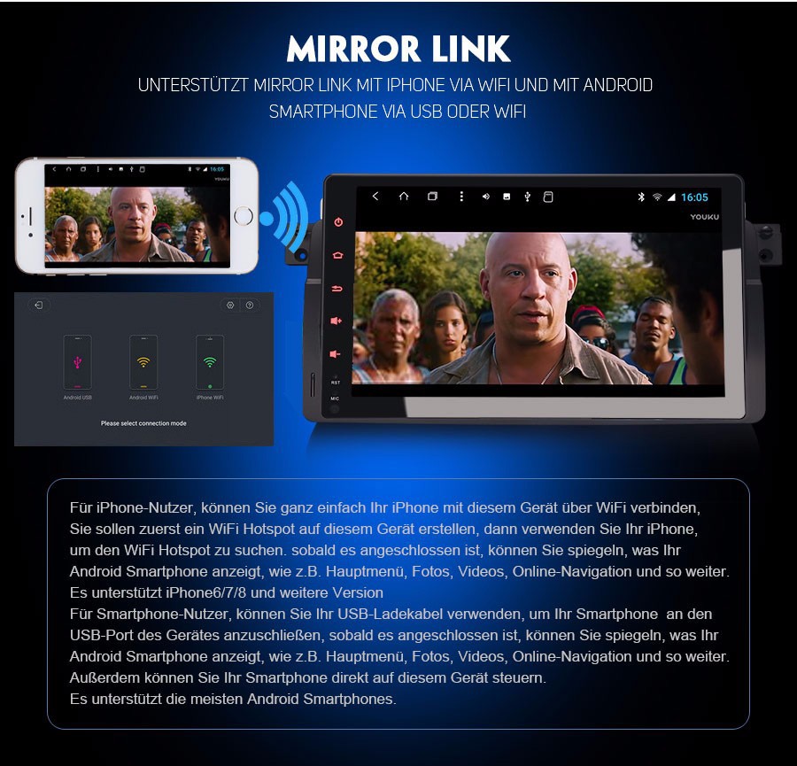- Mirror Link Funktion: Ja, support Mirror Link für iphone und Android Smartphone