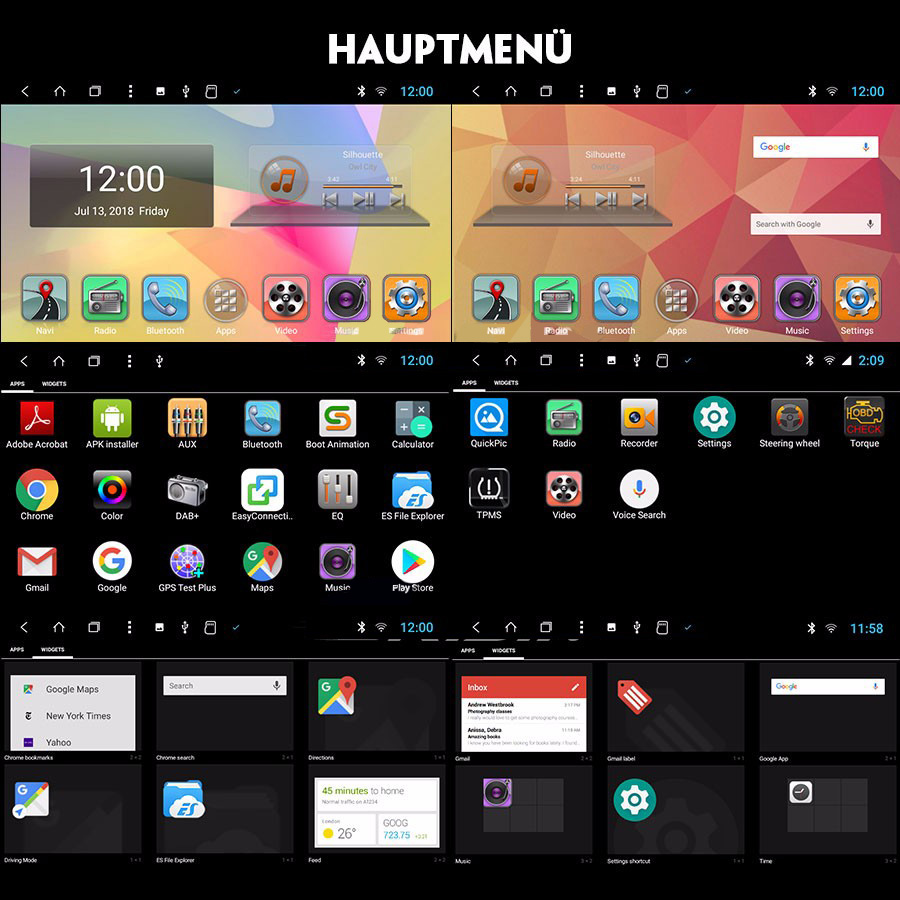 - DIY Hauptmenü display: Ja, Sie können Suchleiste, Musik/Radio/BT- Stereo Player oder Apps auf Hauptmenü ziehen