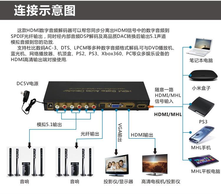 This product supports Dolby digital AC-3, DTS, LPCM and other digital audio format decoding. It is one perfect audio decoder for your DVD, Blue-Ray DVD, PS3, X360BOX, HD Player, PC etc.