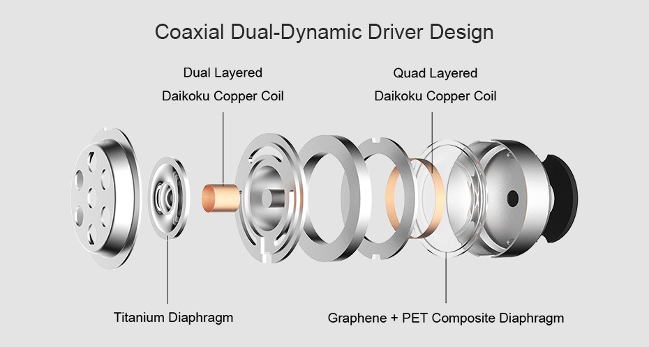 EIN dual-dynamische treiber mit 1 Titan membran + 1 Graphen membran in eine koaxialen design mit zwei äußere schichten von PET liefern überlegene sonic detail mit sizzling höhen, klar mitten, und tiefe bass.