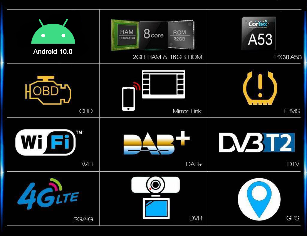 - Extra-Einstellungen: Ausschalt-Verzögerung bei ausgeschaltetem ACC, Musikwiedergabe bei eingestecktem USB oder SD erlauben, Rückfahransicht spiegeln, Rückfahr-Lautstärke, Rückfahr-Kurvenanzeige, Parkradar-Anzeige, Rückansicht-Hilfe