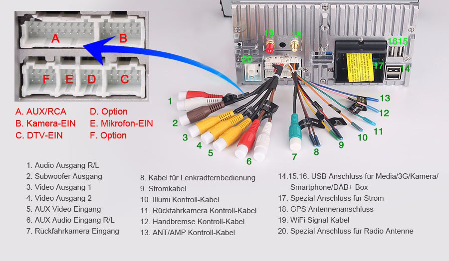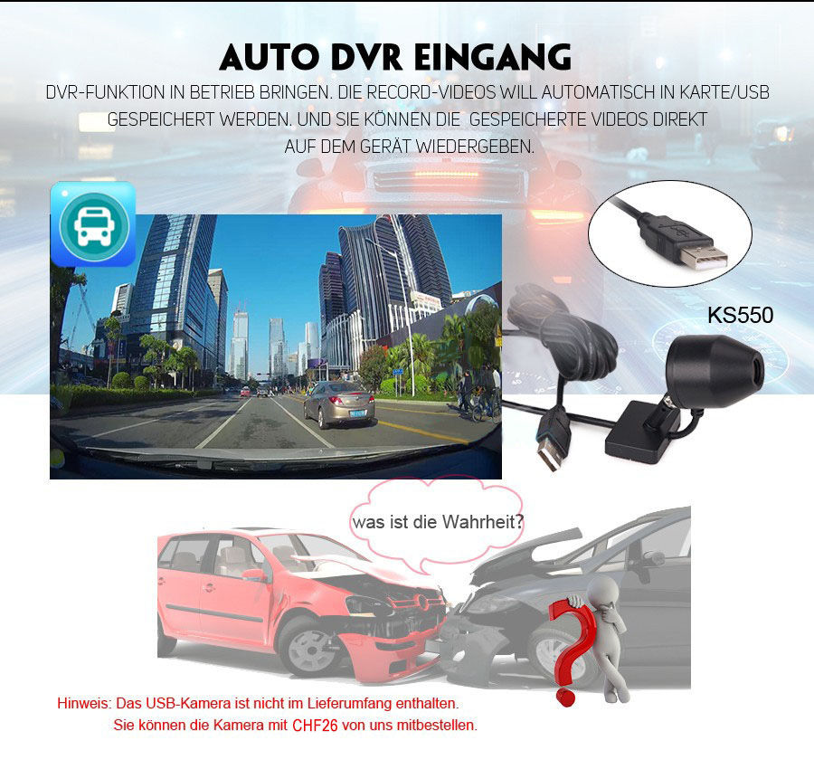 - Position: 3 USB auf dem Rücken, kann als Media/3G/4G/Kamera/DAB+/TPMS/Handy Anschluss