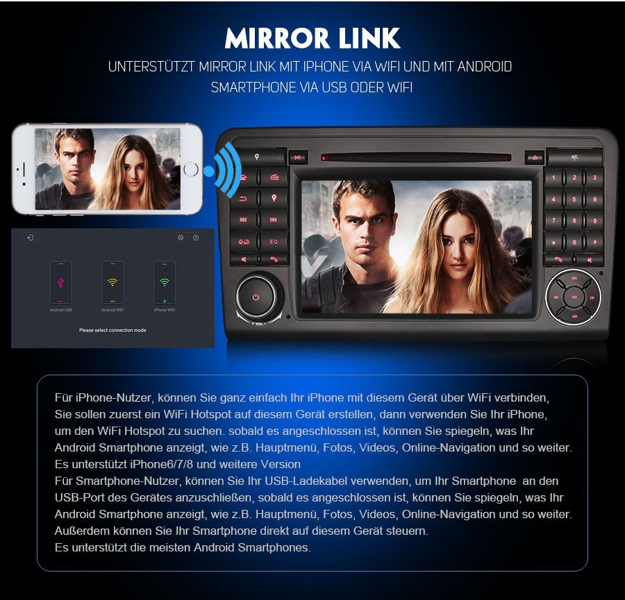 - Mirror Link Funktion: Ja, support Mirror Link für iphone und Android Smartphone