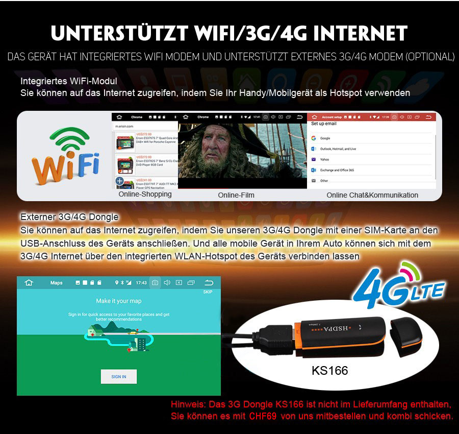 - WiFi Internet: Integrierte WiFi Modul, 802.11b/g/n unterstützen