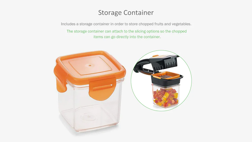 Der Nicer Dicer Quick enthält einen Aufbewahrungsbehälter, um gehacktes Obst und Gemüse zu lagern. Der Aufbewahrungsbehälter kann an die Schnittoptionen angehängt werden, so dass die gehackten Artikel direkt in den Behälter gelangen können.