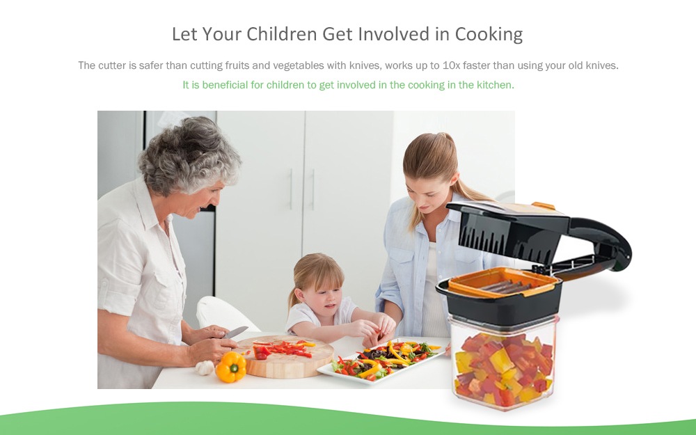Der Nicer Diver Quick ist sicherer als das Schneiden von Obst und Gemüse mit Messern. Dies ist vorteilhaft für diejenigen, die wackelige Hände haben. Es ist auch vorteilhaft für Kinder, sich in der Küche beim Kochen zu engagieren. Der Nicer Dicer ist sicher und einfach zu bedienen. Dieses Produkt sollte jedoch weiterhin unter Aufsicht der Eltern verwendet werden, da die Klingen und Häcksler immer noch sehr scharf sind und Verletzungen verursachen können.