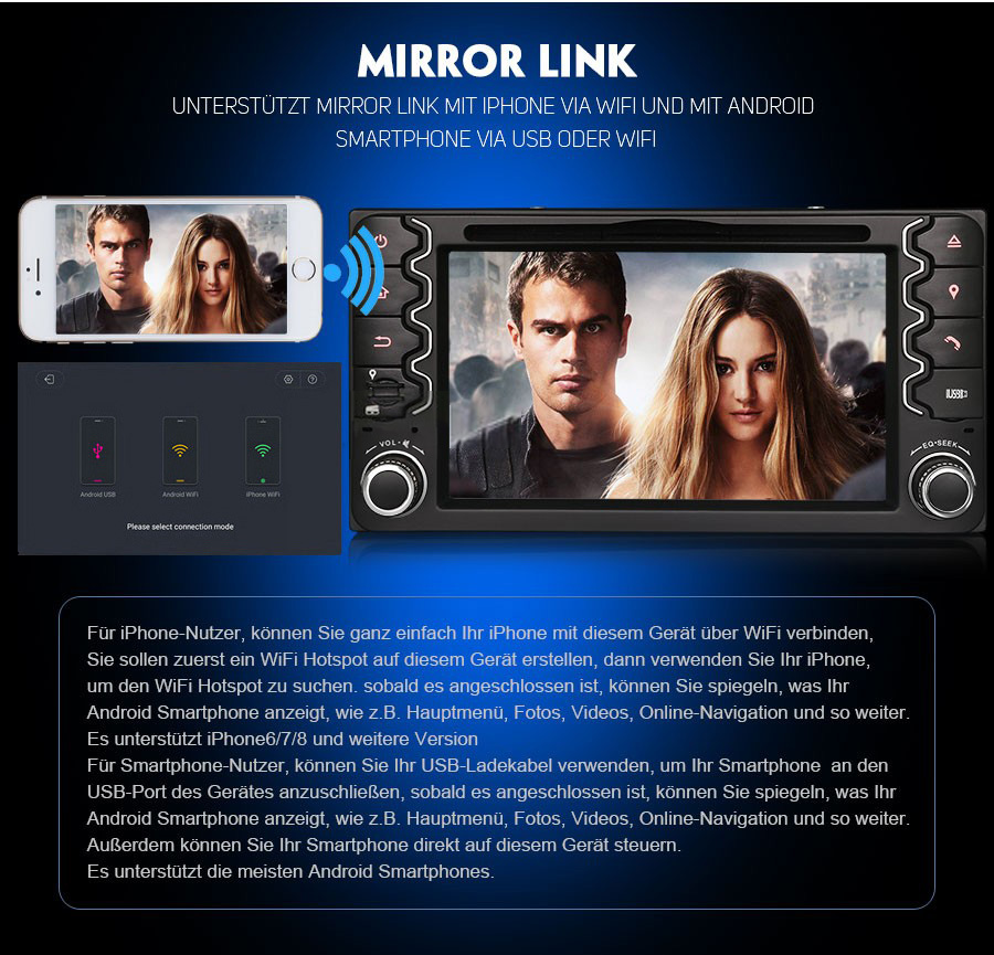 - Mirror Link Funktion: Ja, support Mirror Link für iphone und Android Smartphone