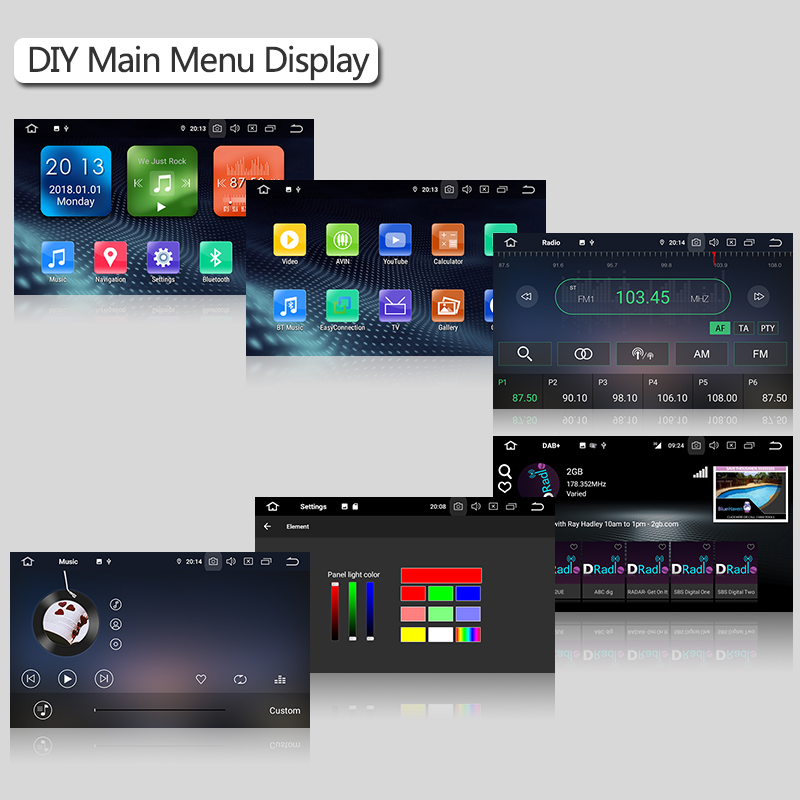 - DIY Hauptmenü display: Ja, Sie können Suchleiste, Musik/Radio/BT- Stereo Player oder Apps auf Hauptmenü ziehen