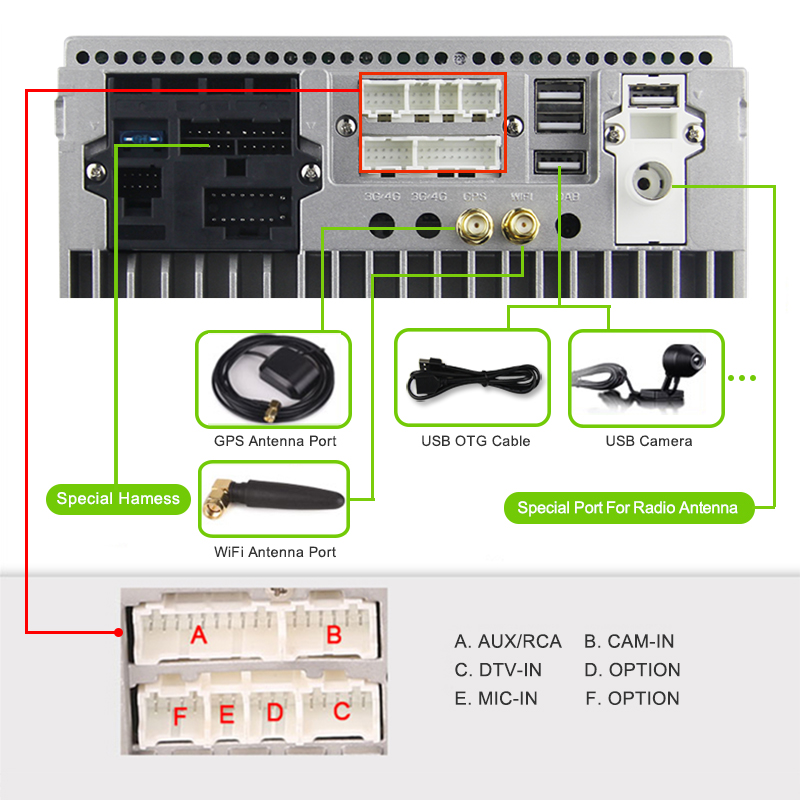 - Position: 2 USB auf dem Rücken, kann als Media/3G/4G/Kamera/DAB+/TPMS/Handy Anschluss