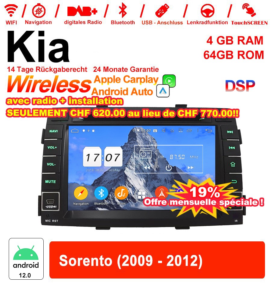 7 Zoll Android 12.0 Autoradio / Multimedia 4GB RAM 64GB ROM Für Kia Sorento 2009-2012 Mit WiFi NAVI Bluetooth USB