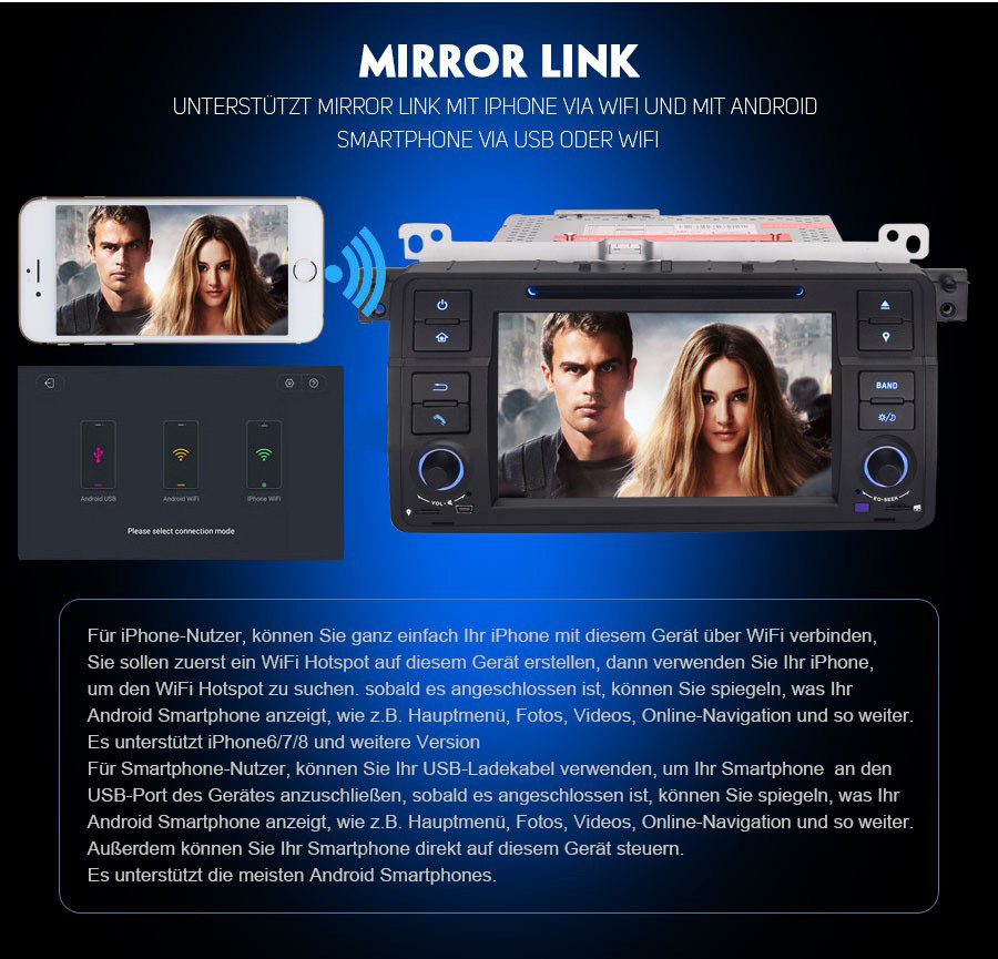 - Mirror Link Funktion: Ja, support Mirror Link für iphone und Android Smartphone