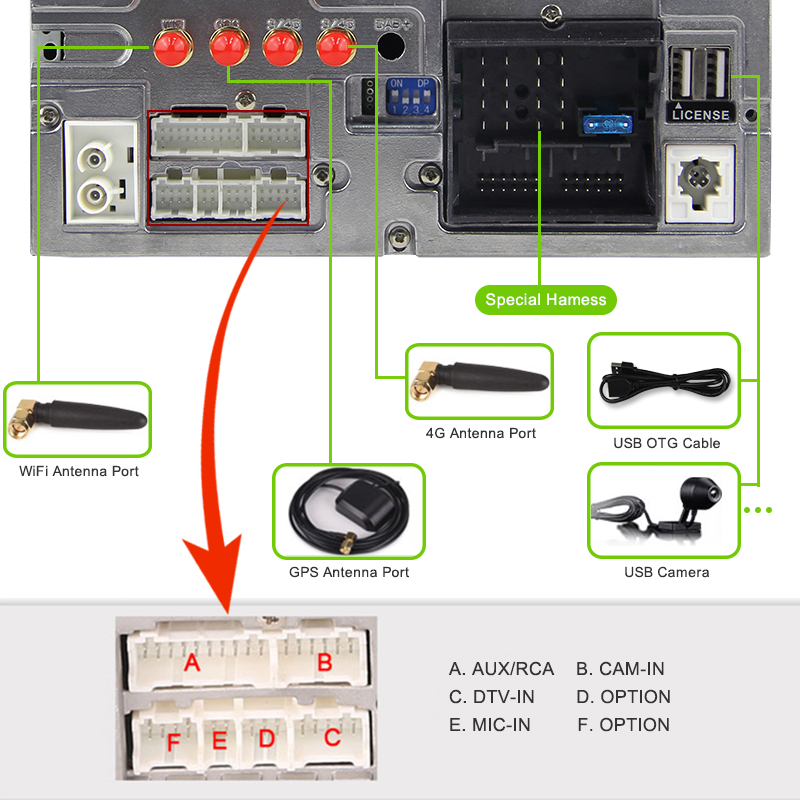 DVD+GPS+Bluetooth+Radio/RDS+ex-TV+built-in WiFi&4G+OBD+DAB+TPMS+Mirror-Link+USB/SD+SWC+AUX IN+Games+built-in Can-Bus+Original Power Port+Original USB port+Original Radio Port+8Colors Button Light full functions