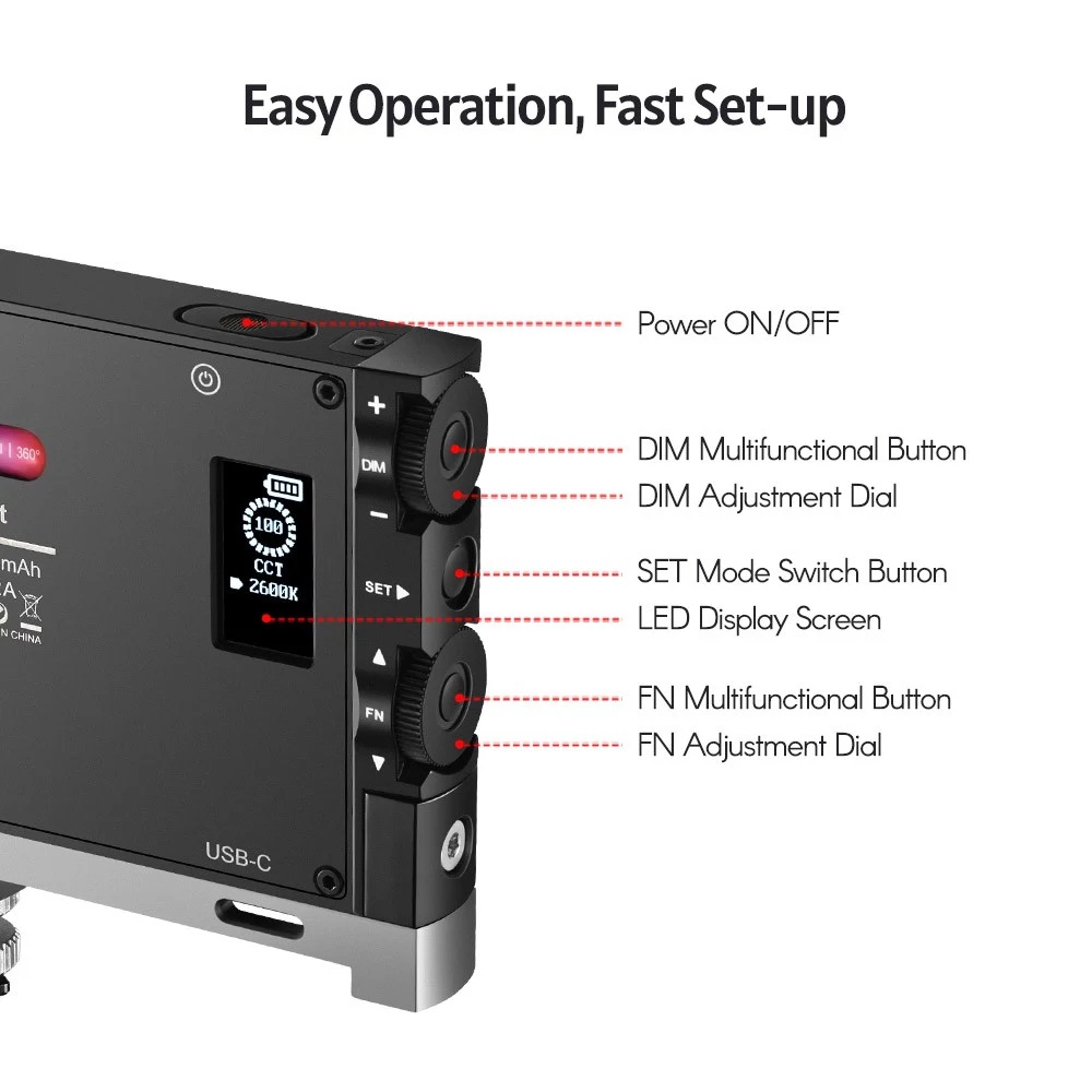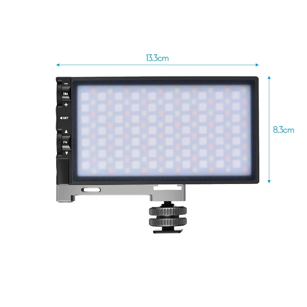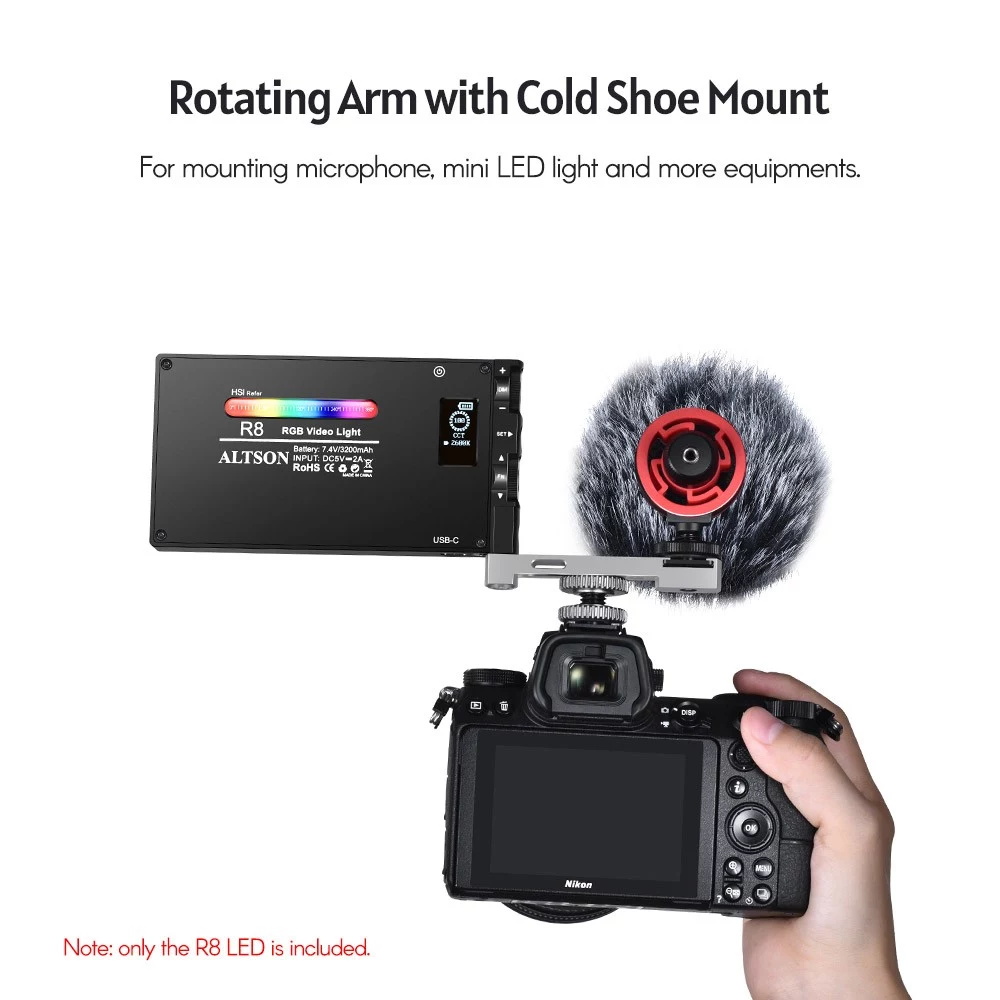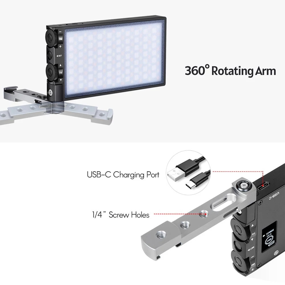 Ausgestattet mit einem um 360 Grad drehbaren Arm mit kaltem Schuh und 1/4-Zoll-Schraubenlöchern können Sie das LED-Lichtpaneel an einer Kamera, einem Stativ oder einem Kugelkopf-Lichtstativ befestigen und ein externes Mikrofon an einem kalten Schuh befestigen, um professioneller fotografieren zu können.
