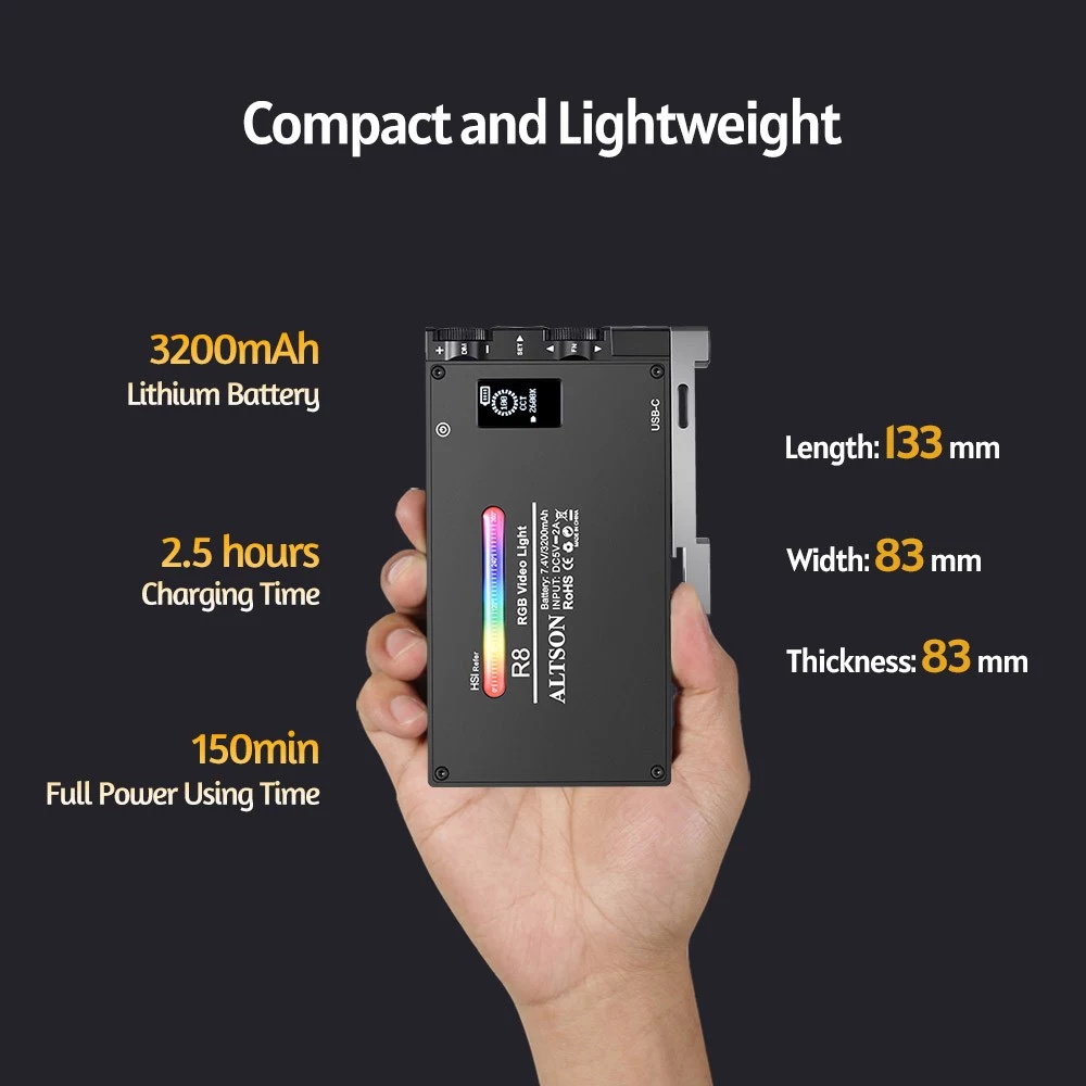 ALTSON R8 RGB Vollfarbenlicht verfügt über 4 Lichtmodi mit insgesamt 12 Lichtszeneneffekten, die an mehrere Szenen angepasst werden können und unendlich viele Möglichkeiten für Ihre Fotografie bieten.