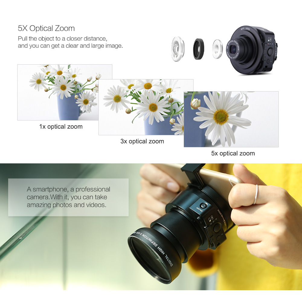 Once you get one AMKOV AMK-OX5, you get a mini camera and camcorder, widely used on different situations, such as party, gathering ect. AMK-OX5 features 20MP with 5X optical zoom, with it you can take high quality and beautiful photos and videos, and wherever you are, whatever you do, you can share them on different social APP.