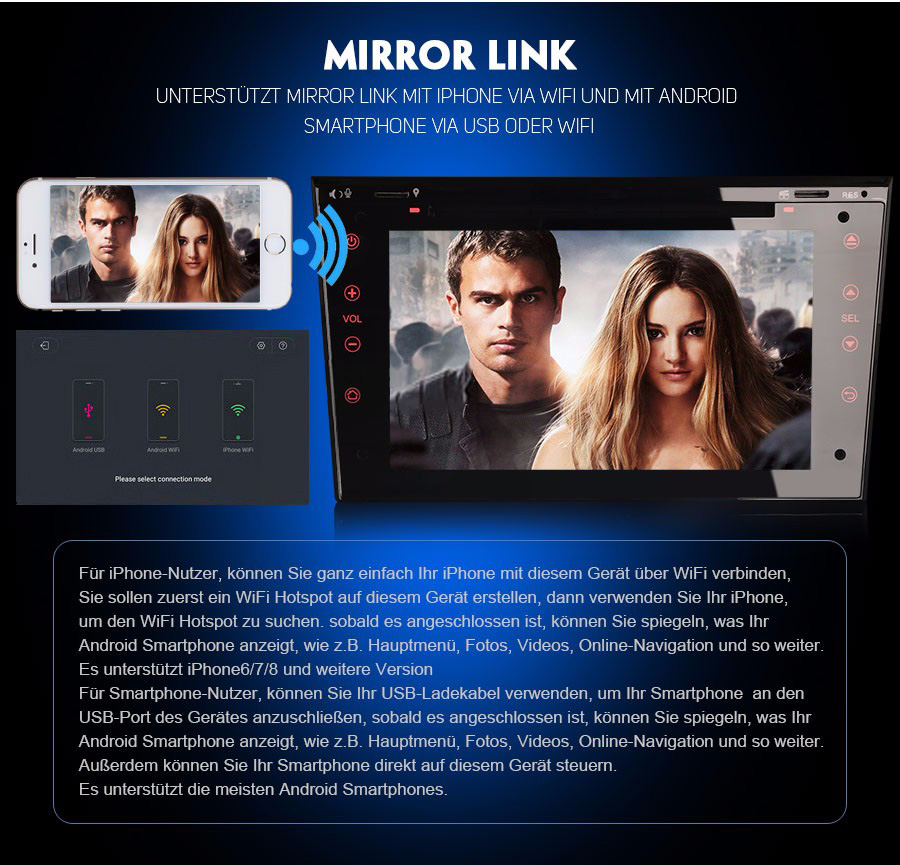 - Mirror Link Funktion: Ja, support Mirror Link für iphone und Android Smartphone