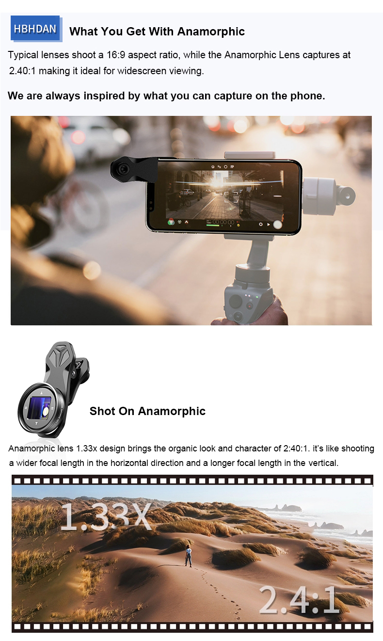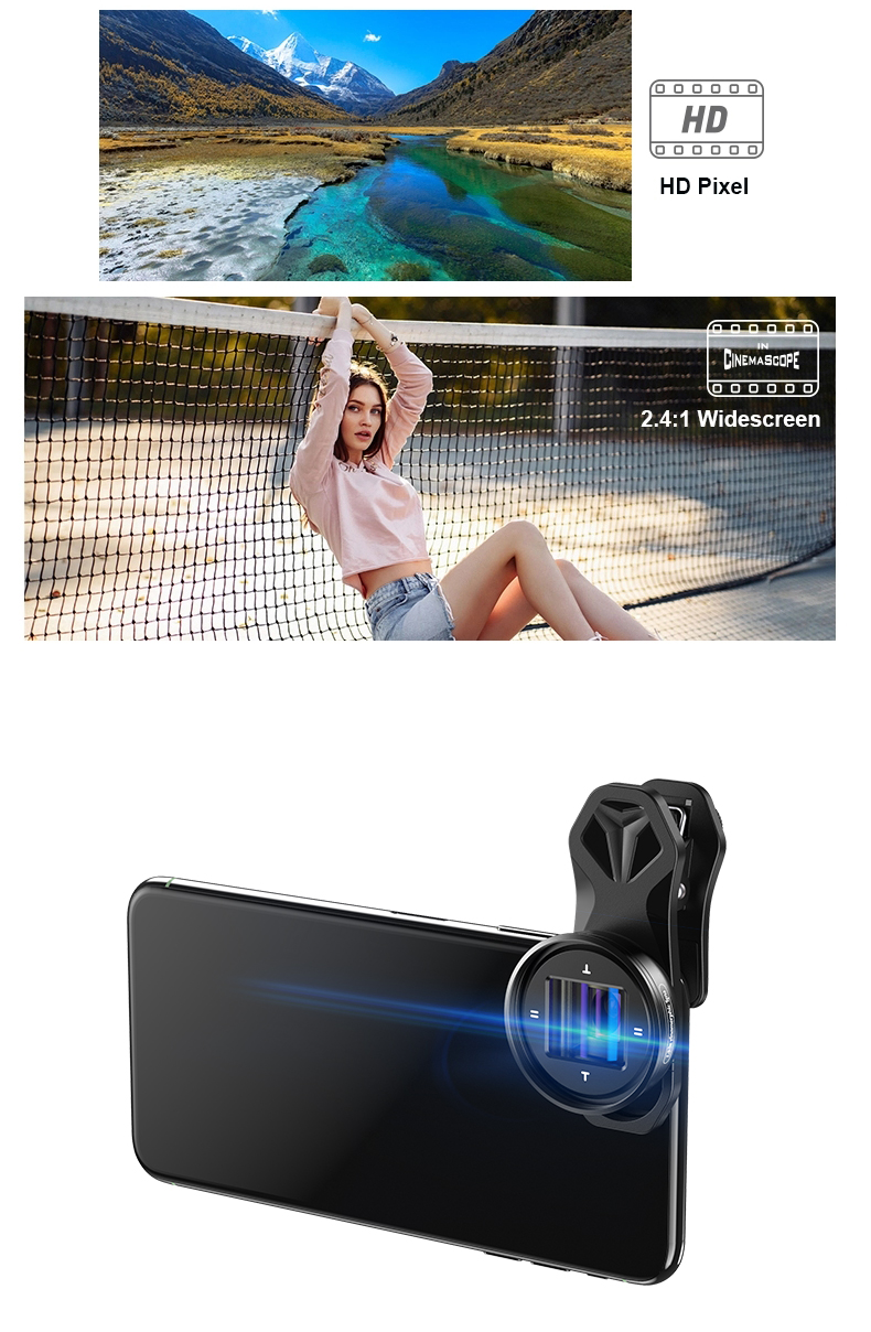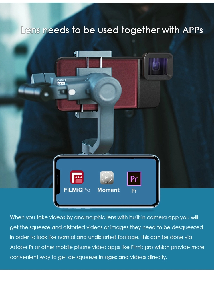 【How es funktioniert? 】The anamorph objektiv bringt die organischen look und charakter von 2:4:1 mit 1,33 x design. es ist wie schießen ein breiter brennweite in die horizontale richtung und eine längere brennweite in die vertikale. Es ist geeignet für hte aufnahme von widescreen videos. arbeitet mit der Pro Kamera App wie (ProMovie,FILMIC PRO) zu de-squeeze die bild, wenn schießen video und fotos. Oder nach schießen durch telefon + 1,33 x anamorph objektiv, verwenden Adobe Premiere Pro software zu ändern die länge der langen und breit von 100