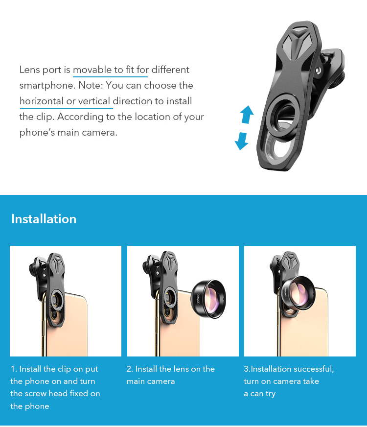 Arbeiten auf den meisten arten von telefon, dass ihre kamera linsen sind nicht größer als 13mm durchmesser. Geeignet für die meisten handys, einfach und bequem zu bedienen. Es kann auf iPhone, Samsung, Windows, HTC ,Lumia, smartphone, iPad, tablet PC und Laptops oder überall sie sich vorstellen können.