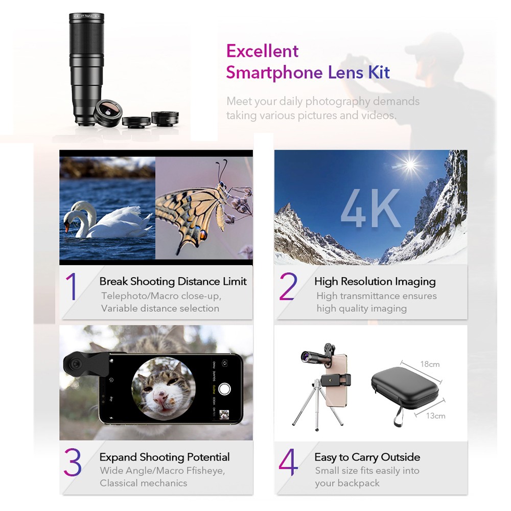 RÜCKSICHTS DESIGN MIT STABILEN STATIV: dieses handy teleobjektiv kommt auch mit eine ausgewogene stativ und die stativ kann ein selfie stick.