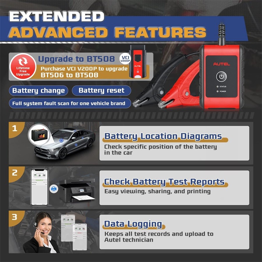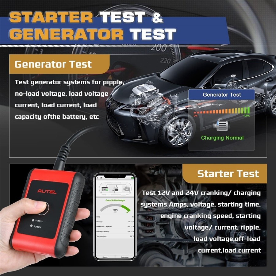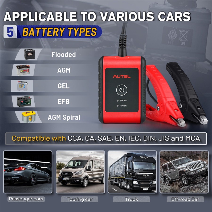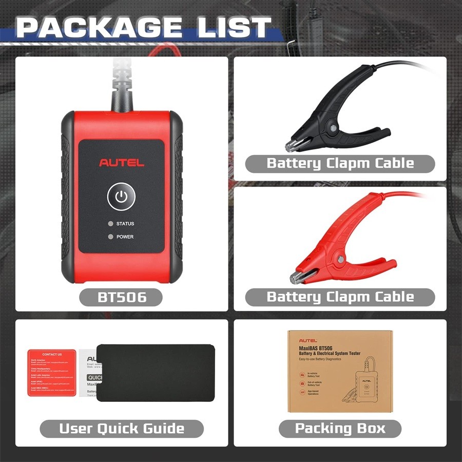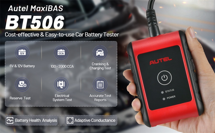 Autel MaxiBAS BT506 digital battery load test tool supports in-vehicle and out-of vehicle testing of 6- and 12-volt, 100 -2000 CCA, Flooded, AGM, AGM Spiral, EFB and GEL batteries, and compatible with major battery test standards CCA, CA, SAE, EN, IEC, DIN, JIS and MCA. It can test almost all the transportation tools batteries such as car, boat, motorcycle or any other. The battery test results include a color-coded results summary, a list of test data, and repair tips.