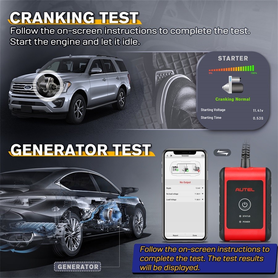 Through the alternator test, technicians are able to check the load voltage/current, no load voltage/current, and ripple. The direct test result on the screen will tell you whether the charging is normal, and whether there is an issue with the output or ripple, which helps avoid damaging the battery and shortening its life due to overcharging or incomplete charging.
