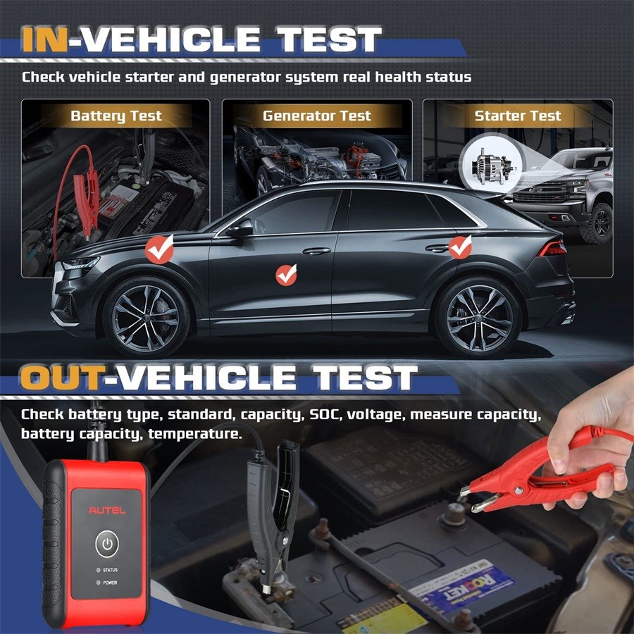 Autel MaxiBAS BT506 kann mit 95 % Autel-Diagnosetabletten für detaillierte Fahrzeugbatterie-, Anlass-, Starter- und Generatortests verwendet werden, wie z. MK908, MK908P, MS908S Pro, Elite, Elite 2, MS909, MS919, Ultra Lite, Ultra.