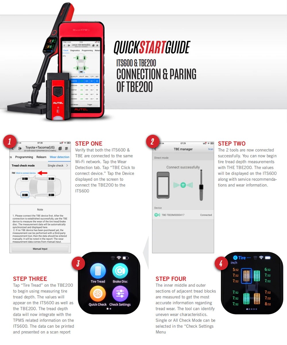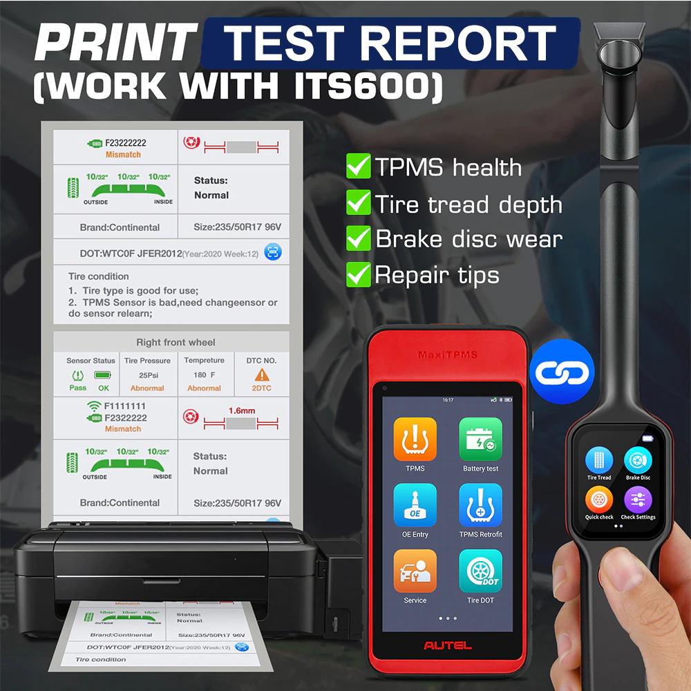 Autel TPMS diagnose werkzeug ITS600E können verbinden zu Autel TBE examiner TBE200E über Wi-Fi direct modus zu erhalten lauffläche tiefe & bremsscheibe tragen messungen und erzeugen eine bericht die komponiert detaillierte TPMS diagnose ergebnisse, reifen lauffläche tiefe, und bremsscheibe tragen messungen ergebnisse sowie entsprechende reparatur vorschläge.