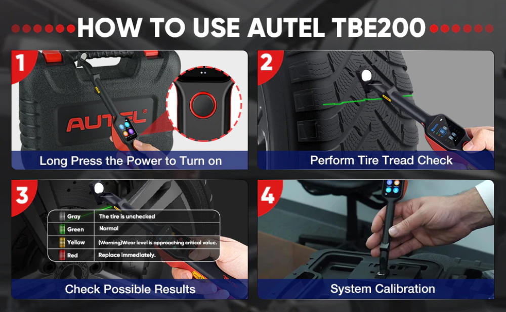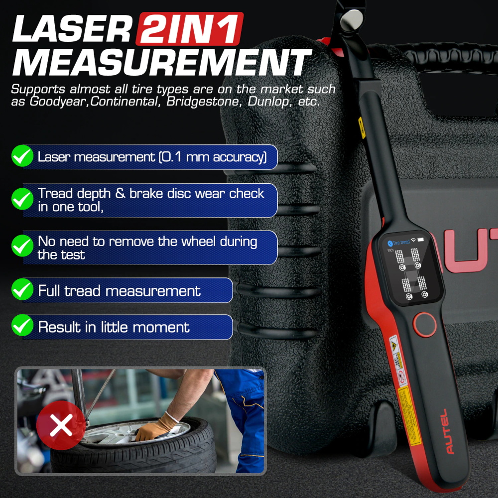 Mit laser technologie, die Reifen Lauffläche anwendung analysiert die tragen der reifen auf fahrzeuge mit keine notwendigkeit, zu entfernen die reifen. Platz der werkzeug auf die reifen, und die werkzeug projekte eine laser strahl. Die tragen messung ist dann gesendet, um die display bildschirm mit einer genauigkeit innerhalb 0,1mm. Messungen sind auch angezeigt grafisch. Die Reifen Lauffläche anwendung bietet zwei arten von kontrollen: “Alle Laufflächen” und “Einzelnen.” wenn sie dieses anwendung, eine nachricht wird display woraufhin benutzer zu wählen zwischen der aktuelle modus die alternative ein.