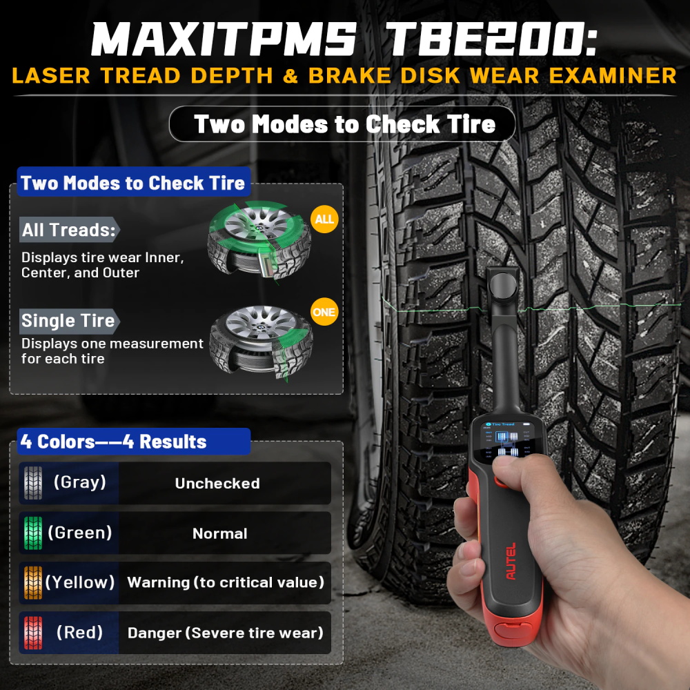 ● Die MaxiTPMS TBE200E ist ein laser-aktiviert reifen lauffläche tiefe & bremsscheibe tragen examiner, dass bietet benutzer mit schnelle und genaue tragen messungen.