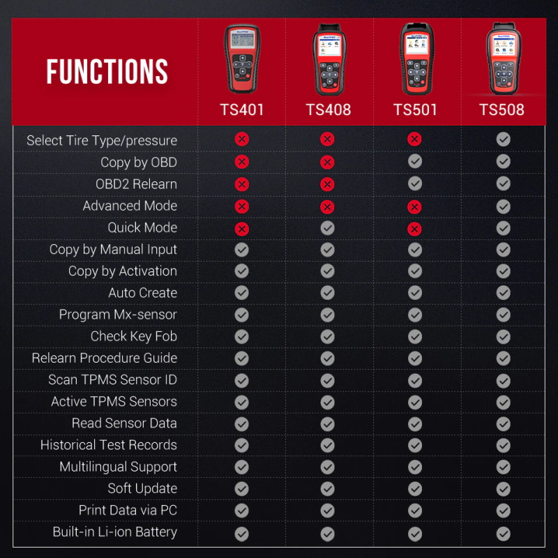 With Quick Mode and Advanced Mode options, you can save time and energy by choosing the most suitable way to complete TPMS work. TS508K, the starting TPMS kit with one tool and 8 sensors, can be your right choice to experience AUTEL TPMS lines.