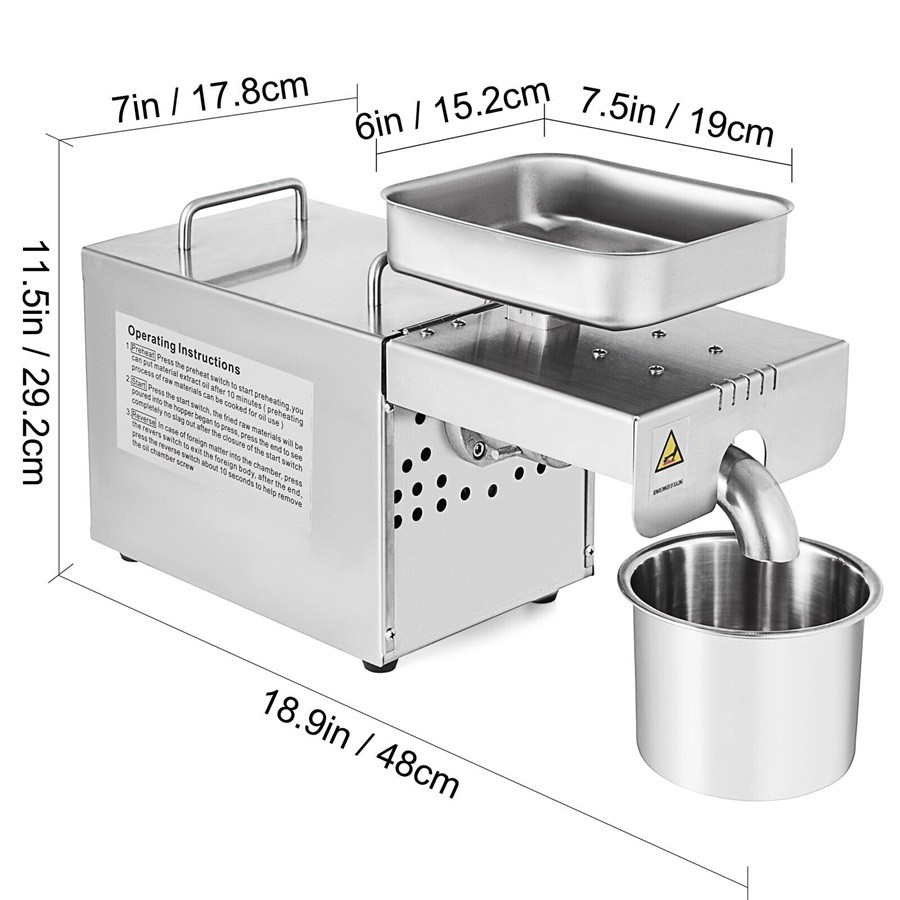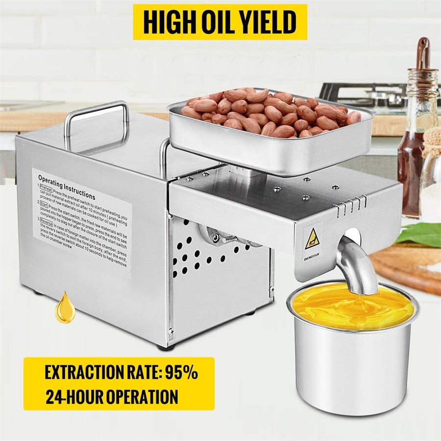 Die Ölpressmaschine ist leicht zu bedienen und zu reinigen. Drücken Sie einfach den Knopf und schon können Sie das nährstoffreichste Öl kosten. Sie wird außerdem mit einem Paar Isolierhandschuhen, zwei Reinigungsbürsten und einem Trichter geliefert.