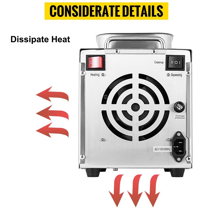 Die Ölpresse verfügt über eine Drei-Wege-Pressfunktion: Heißpressen, Kaltpressen und Frittierset. Das Kühltemperatursystem und die Luftabsaugung können die Durchschnittstemperatur des Motors sicherstellen und dafür sorgen, dass er länger arbeitet.