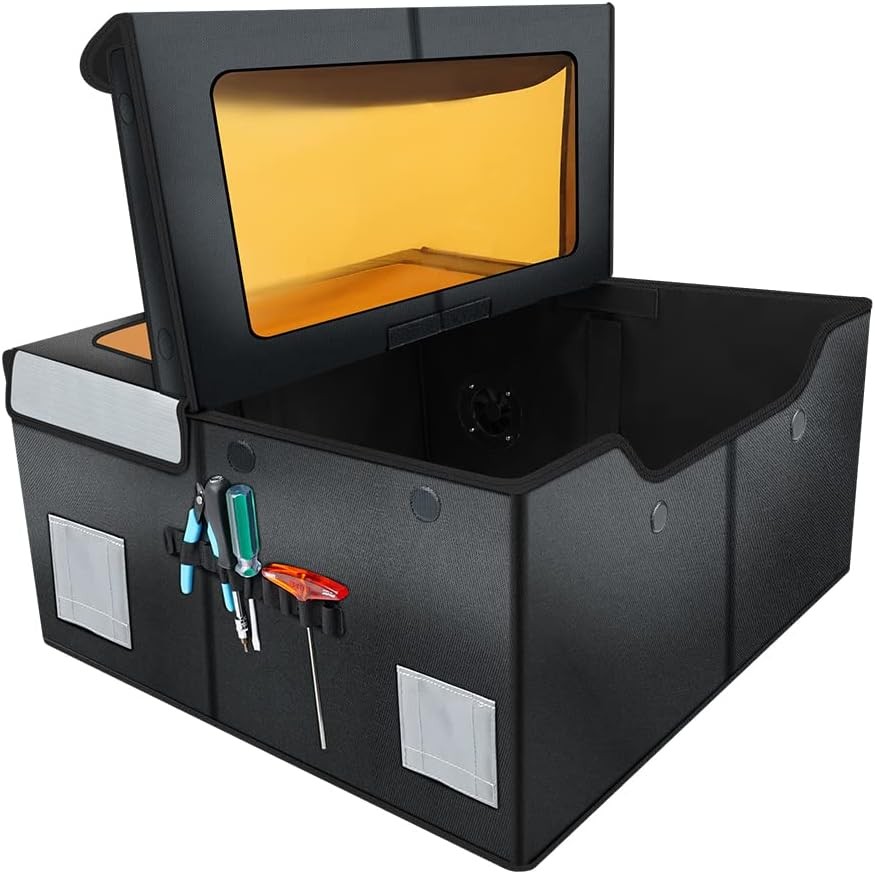 Modernes und humanisiertes Design: Das Gesamtdesign basiert auf einem zusammenklappbaren, einteiligen Design, das innerhalb einer Minute effizient zusammengebaut werden kann und einsatzbereit ist. Mit Aufbewahrungsnetztaschen und Riemen auf beiden Seiten können Sie Ihre Werkzeuge einfach aufbewahren und verwalten. Auf der Oberseite des Gehäuses befinden sich zwei 21,14 x 9,84 Zoll (537 x 250 mm) große Sichtfenster aus Laserfilter-PC, mit denen Sie den Lasergravur- und -schneidvorgang sicherer beobachten können.