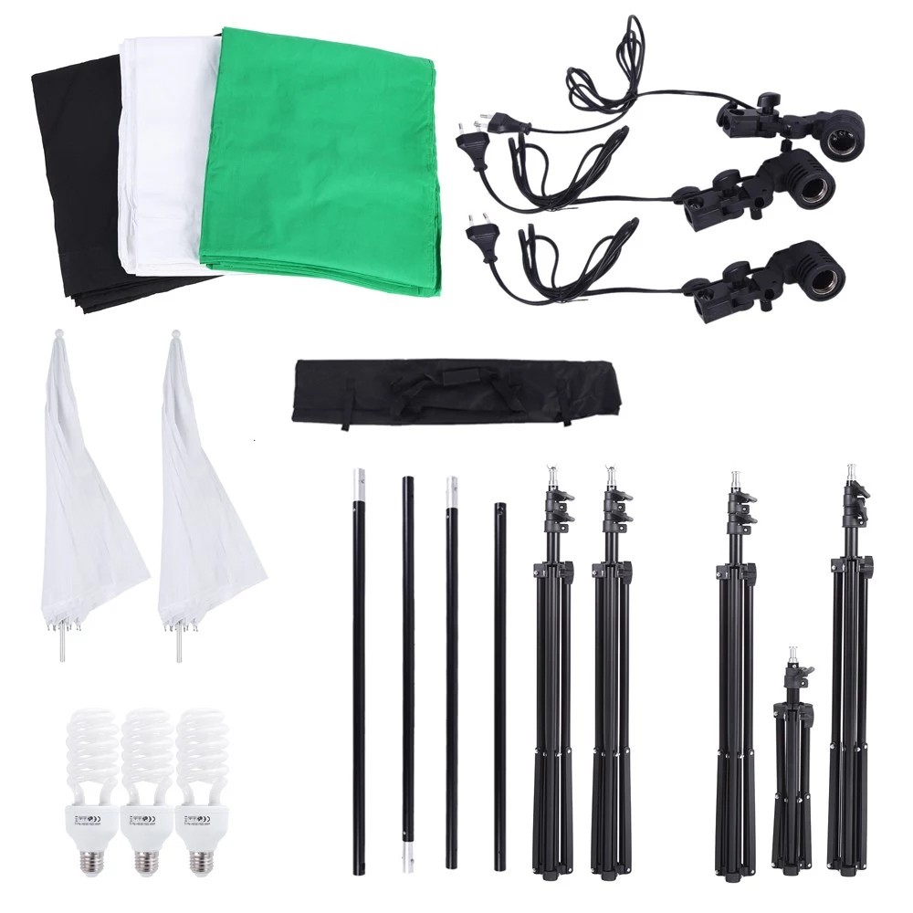 Dieses Set enthält den Hintergrund Stand Satz, 3pcs Hintergrund Licht steht, Sonnenschirme, Blumenzwiebeln und E27 Schwenkbuchse.