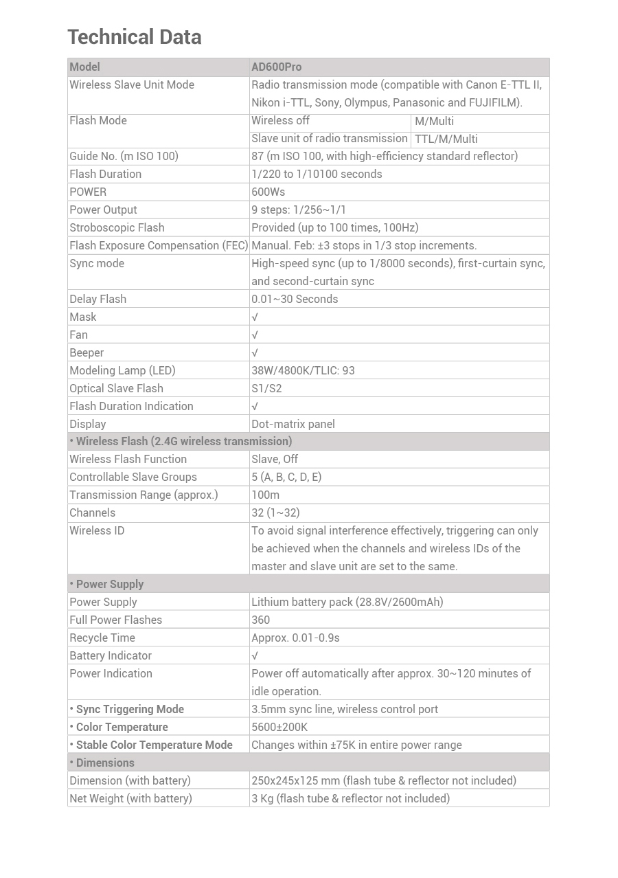 Net Gewicht (mit batterie): 3Kg (flash rohr & reflektor nicht im lieferumfang enthalten)