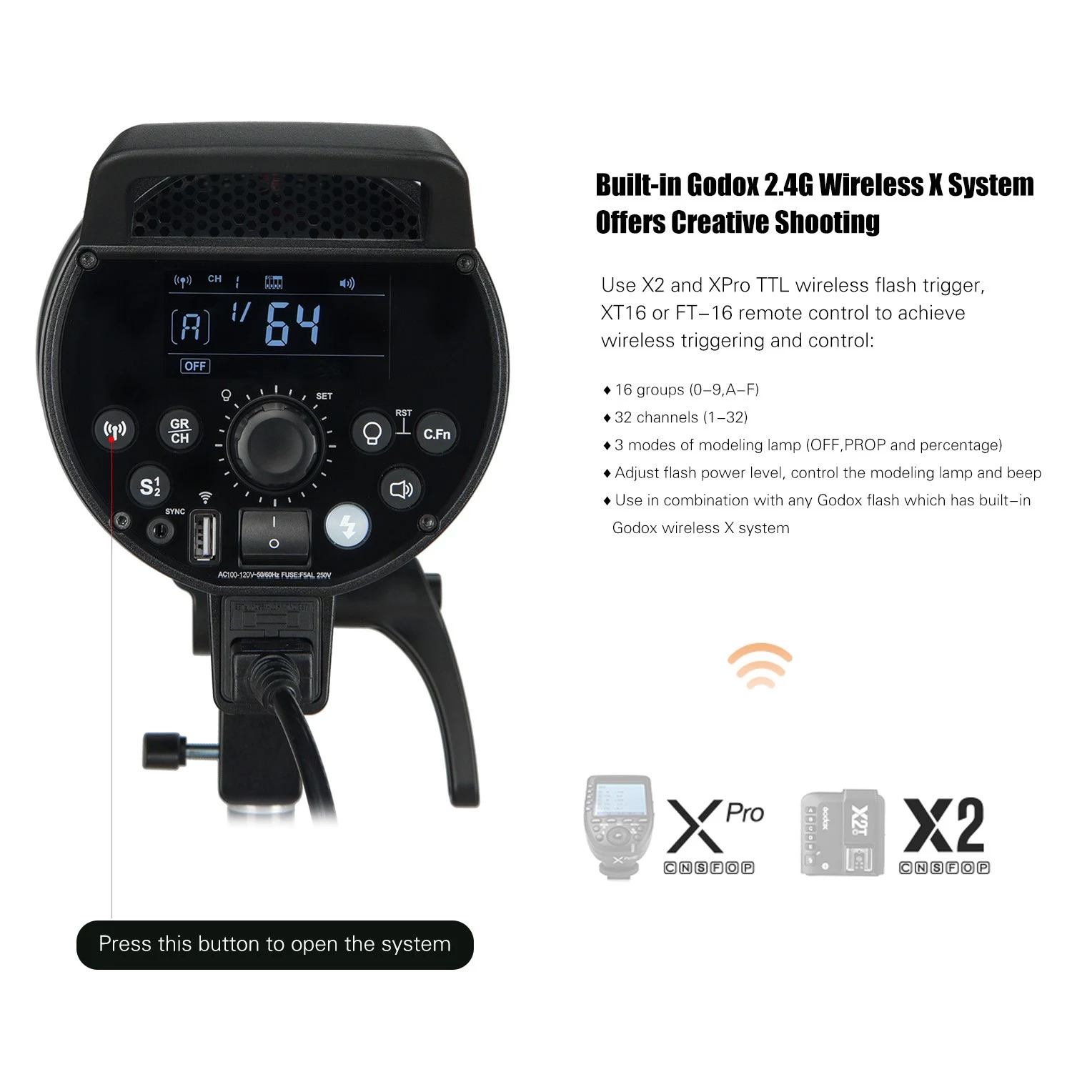 Eingebautes Godox 2.4G Wireless X-System mit herausragenden Funktionen. Verwenden Sie den drahtlosen Flash-Trigger X2 oder XPro TTL, die XT16- oder FT-16-Fernbedienung, um eine drahtlose Synchronisierung zu erreichen. (Funkblitzauslöser und Fernbedienung sind nicht im Lieferumfang enthalten)