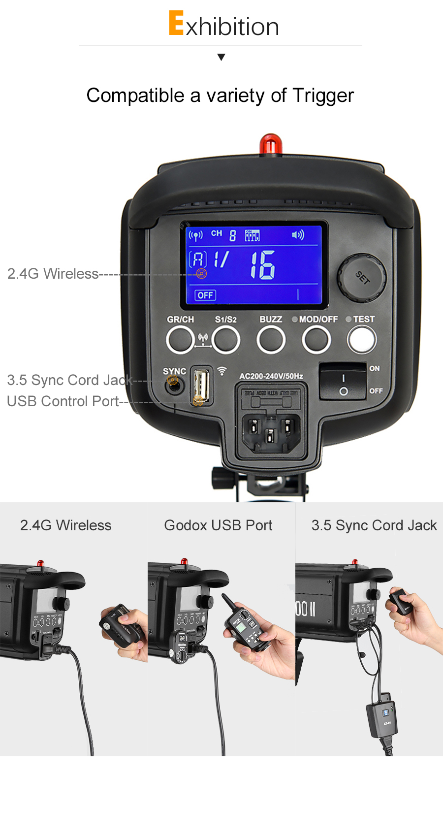 Auslösender Modus : Synchrokabel, Slave-Auslösung, Prüftaste, drahtloser Steueranschluss