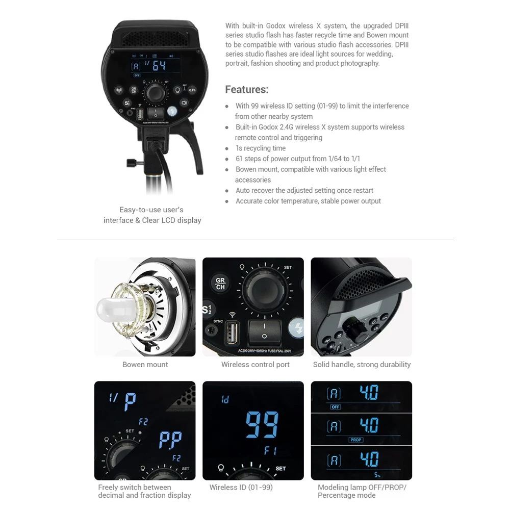 Mit dem integrierten Godox Wireless X-System bietet der aktualisierte Studioblitz der DPIII-Serie eine schnellere Recyclingzeit und eine Bowen-Halterung, die mit verschiedenen Studioblitzzubehörteilen kompatibel ist. Studioblitze der DPIII-Serie sind großartige Lichtquellen für Hochzeiten, Porträts, Modeaufnahmen und Produktfotografien.