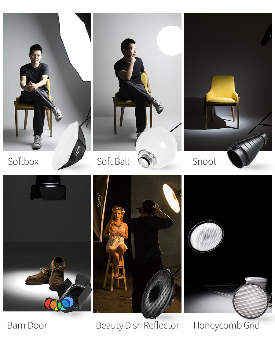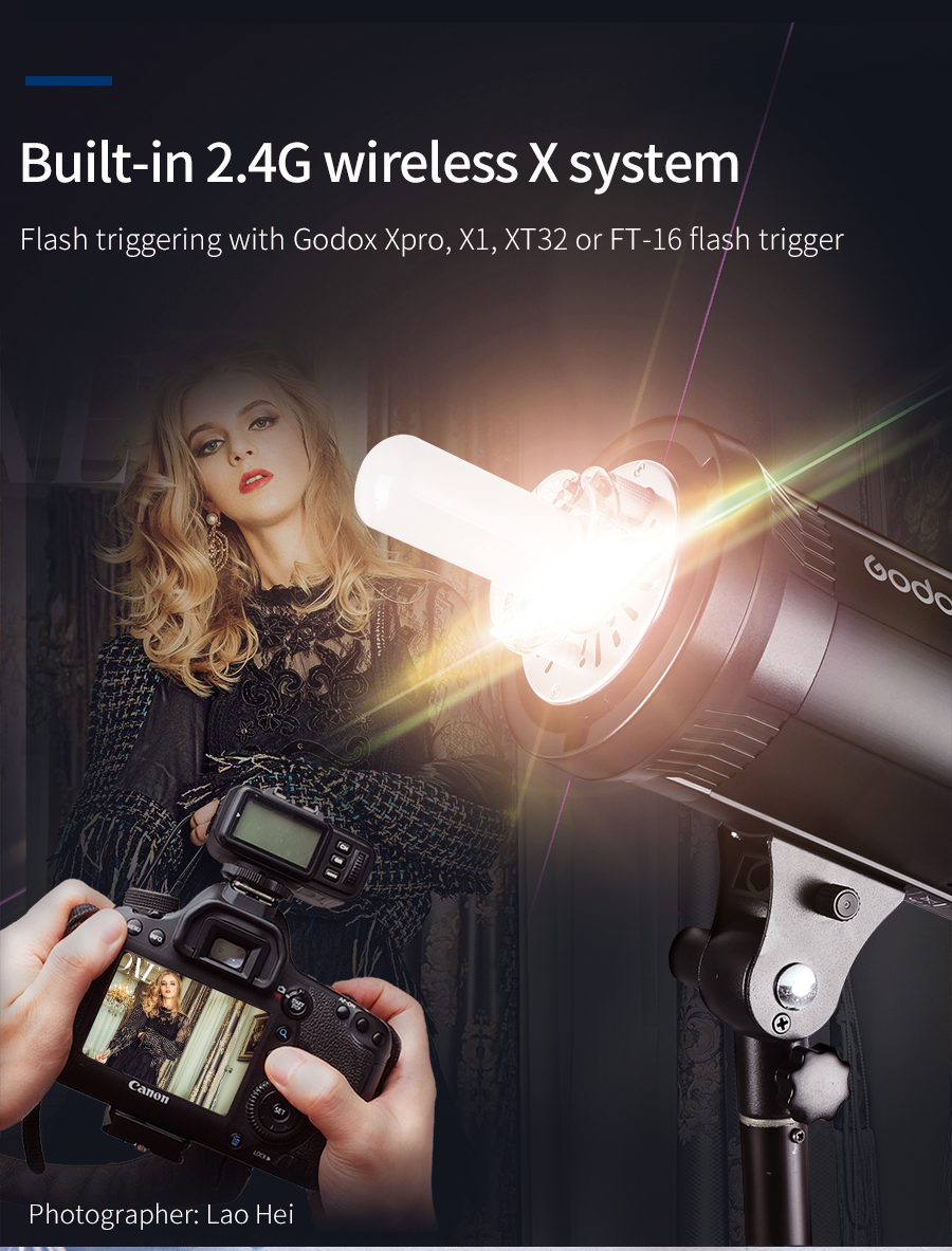 - Drahtlose Steuerung des Blitzleistungsverhältnisses, des Ein- und Ausschaltens von Einstelllicht und Summer sowie der Blitzauslösung mit Godox Xpro, X1, XT32 oder FT-16 Blitzauslöser