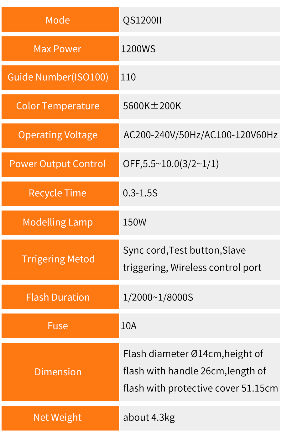 - Die QSII-Serie bietet ein Recycling von 0,3 bis 1,5 Sekunden und eine Blitzdauer von 1/800 bis 1/2000 Sekunden.