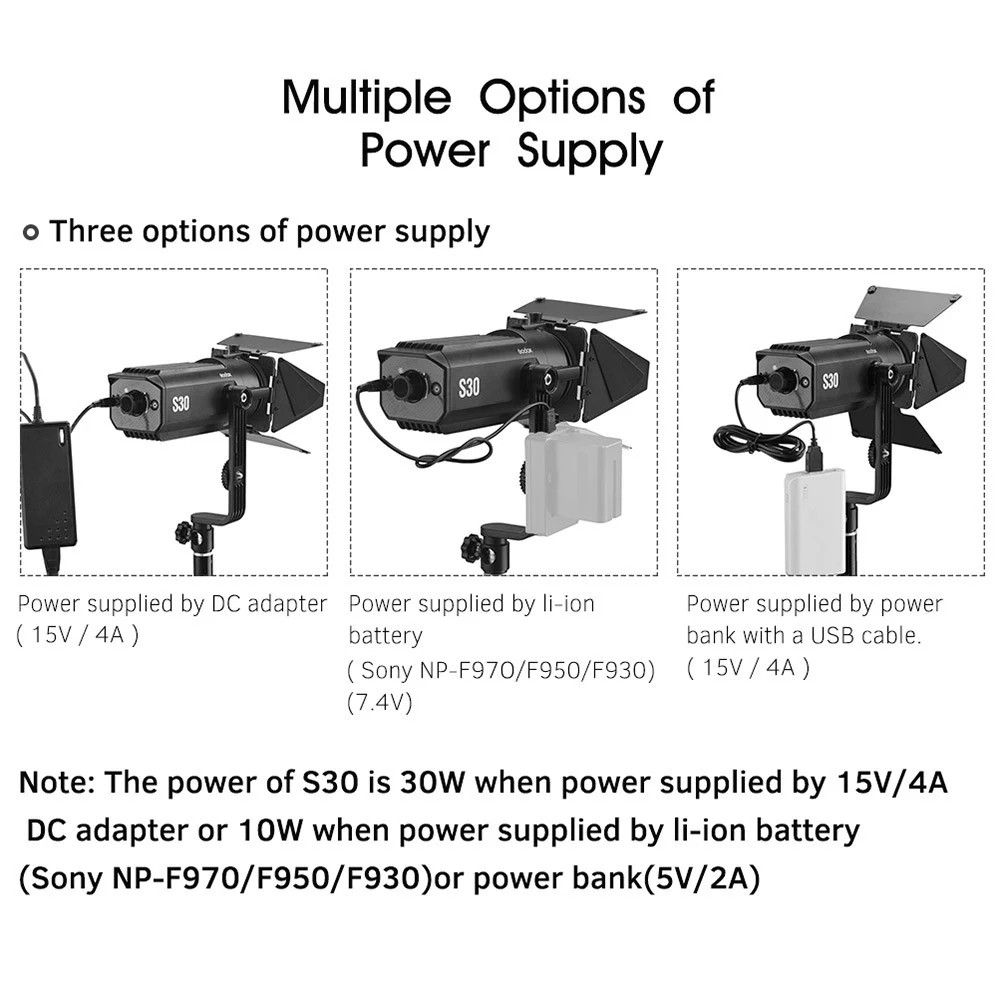 Mehrere Optionen von Power Versorgung:Drei optionen von power versorgung: Power geliefert durch DC adapter (15 V/4A); power geliefert durch externe li-ion akku (7,4 V NP-F970/F950/F930); power geliefert durch externe power bank mit einem usb-kabel (5 V/2A).