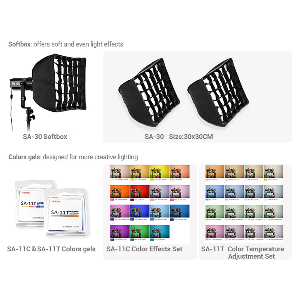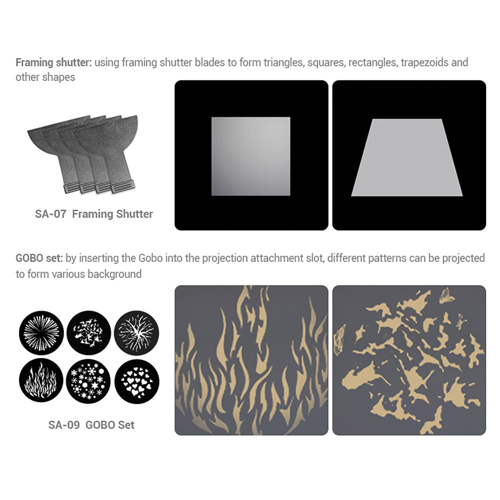 Kompatibel mit Reichlich Zubehör zu Erzeugen Kreative Licht Effekte:Die erreichung der präzision beleuchtung für jeden gewünschten effekt und schöpfung mit die S30 und die präzision licht gestaltung zubehör, einschließlich SA-P Projektion Befestigung, SA-08 Torblende Set, SA-07 Framing Shutter, SA-09 GOBO Set, SA-05 Gelege Set, SA-06 Irisblende, SA-30 Softbox und SA-11C & SA-11T Farbe Filter.