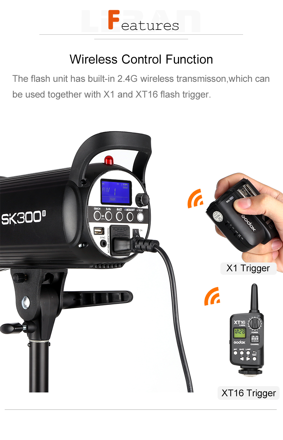 Mit dem integrierten Godox 2.4G Wireless X-System ist die SKII-Serie ein kostengünstiger Compact-Flash-Blitz für E-Commerce-Produktaufnahmen, Porträt- und Lifestyle-Fotografie. Bei kleinen und mittleren Studioaufnahmen kann es als High Light, Hintergrundlicht oder Haarlicht verwendet werden.