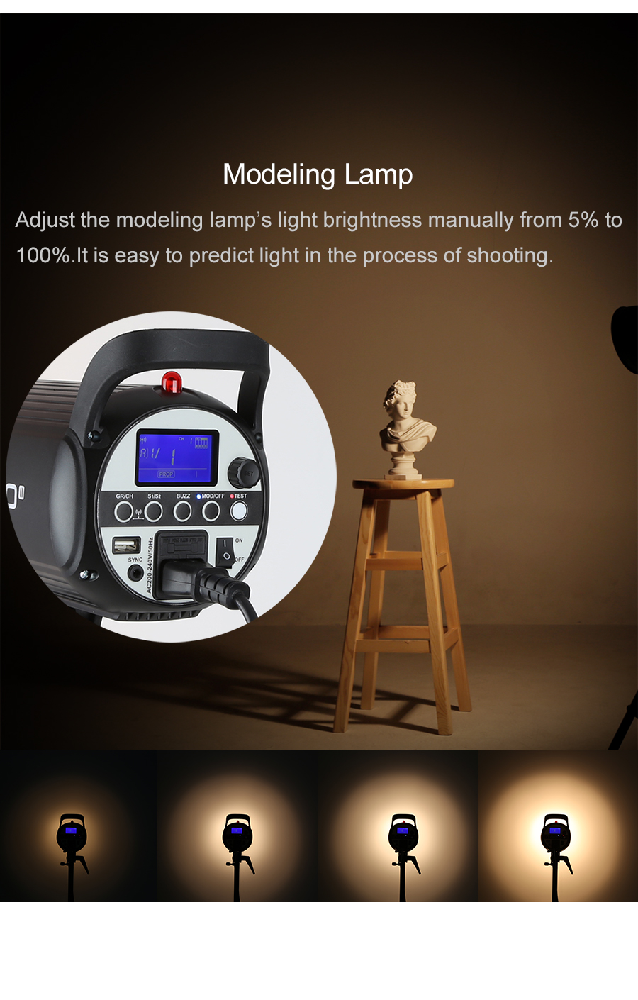 - Die 150-W-Modellierlampe kann von 5% bis 100% eingestellt werden