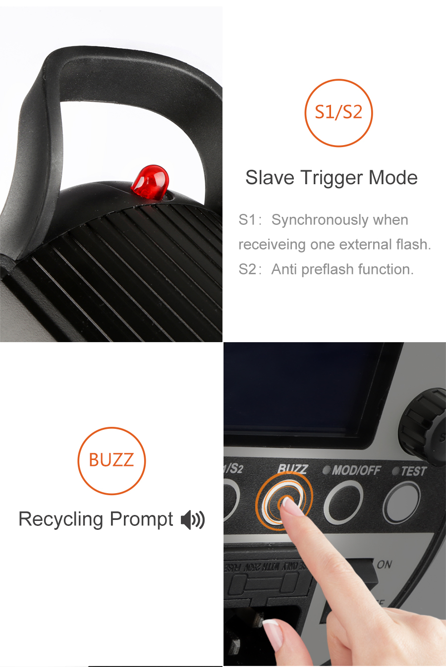 - Die Anti-Preflash-Funktion ermöglicht die Synchronisation mit Kameras mit einem One-Preflash-Zündsystem