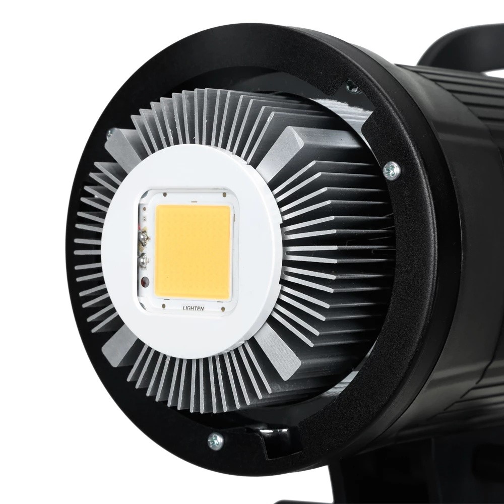 Sie ist eine tageslichtbalancierte 5600K-Leuchte mit einer COB-LED (Chip on Board) für hohe Helligkeit und Farbgenauigkeit. Das intuitive Design der Leuchte umfasst einen hinteren LCD-Monitor und ein Zifferblatt mit einer 10-100%igen Dimmung. Eine dedizierte drahtlose Fernbedienung ist auch für die Helligkeitssteuerung sowie für die Gruppierung von Leuchten für mehrere Leuchtenkonfigurationen enthalten. Um eine konsistente und kontinuierliche Nutzung zu gewährleisten, sind außerdem ein Kühlkörper und ein eingebauter Lüfter zur Temperaturregelung sowie eine spezielle Temperaturkontrollfunktion zum Schutz der LED selbst vorhanden. Die Leuchte ist auch für die Aufnahme von Bowens S-Mount-Lichtmodifizierern und Zubehör, wie z.B. den mitgelieferten Reflektor, konfiguriert, und die LED hat auch eine klare Abdeckung für zusätzlichen Schutz.