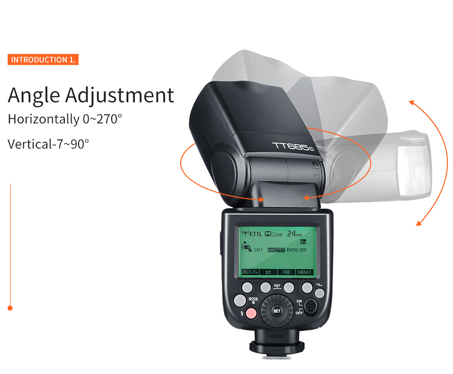 Manuelle zoom : Swinging/betitelung flash kopf, 270 grad horizontal und 90 grad vertikal (bounce flash)