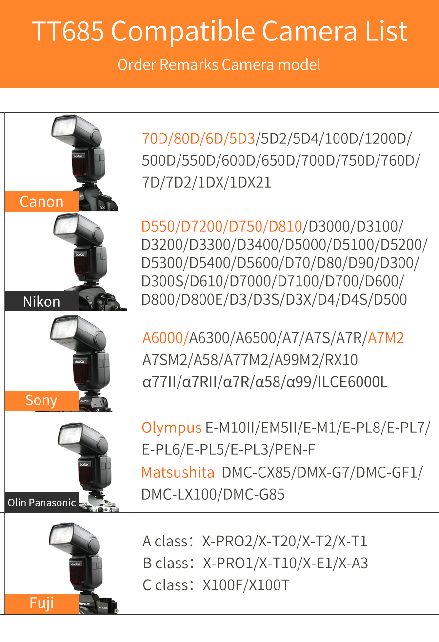 1x Godox Thinklite TT685-C/N/S/F/O Speedlite