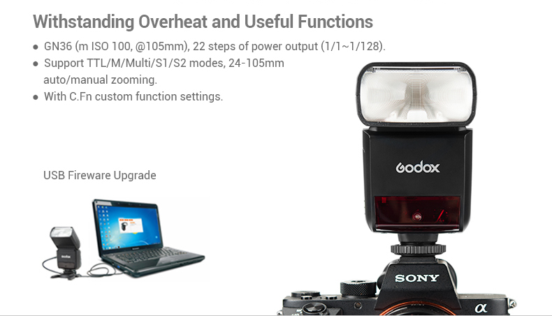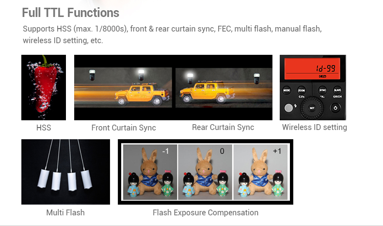 2,4G drahtlose übertragung, unterstützt 1/8000 s high-speed-sync, TTL autoflash, manuelle blitz, multi flash, flash exposition entschädigung, manuelle focus assist, hinten vorhang, etc.