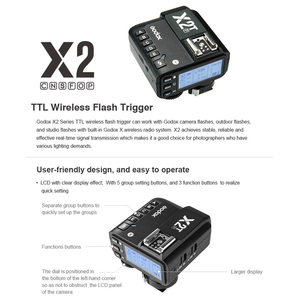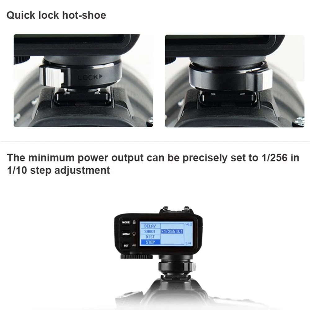 Benutzerfreundliches Design und einfache Bedienung: LCD mit klarem Anzeigeeffekt; mit 5 Gruppen-Einstelltasten und 3 Funktionstasten zur schnellen Einstellung; verlegtes Steuerrad; Schnellverschluss Hot-Shot.
